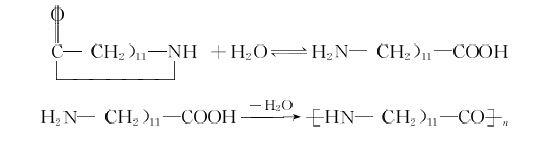 月桂內(nèi)酰胺在鹽酸、硫酸、硼酸或己二酸等酸催化劑存在下,進(jìn)行水解開環(huán),生成00-氨基十二酸,再經(jīng)縮聚得尼龍12。反應(yīng)式如下:
